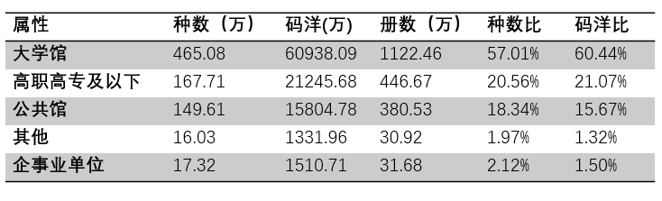 在各類圖書館中,大學(xué)館的單冊(cè)圖書平均定價(jià)最高,為53.27元,公共館的單冊(cè)圖書平均定價(jià)最低,僅為41.49元??梢姽拆^目前仍然以定價(jià)較低的大眾類圖書為主,專業(yè)書籍占比較低。