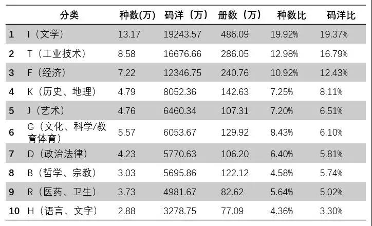 2014年至2017年,圖書種類中貢獻(xiàn)最高的門類一直是文學(xué)、工業(yè)技術(shù)、經(jīng)濟(jì)、歷史地理、藝術(shù)。這五類圖書的碼洋總占比一直保持在60%以上,今年則達(dá)到63.21%,為近五年來最高的一次。這主要是由于公共圖書館市場(chǎng)的迅速發(fā)展造成文學(xué)類碼洋占比從2016年的17.63%提升到了2017年的19.37%。