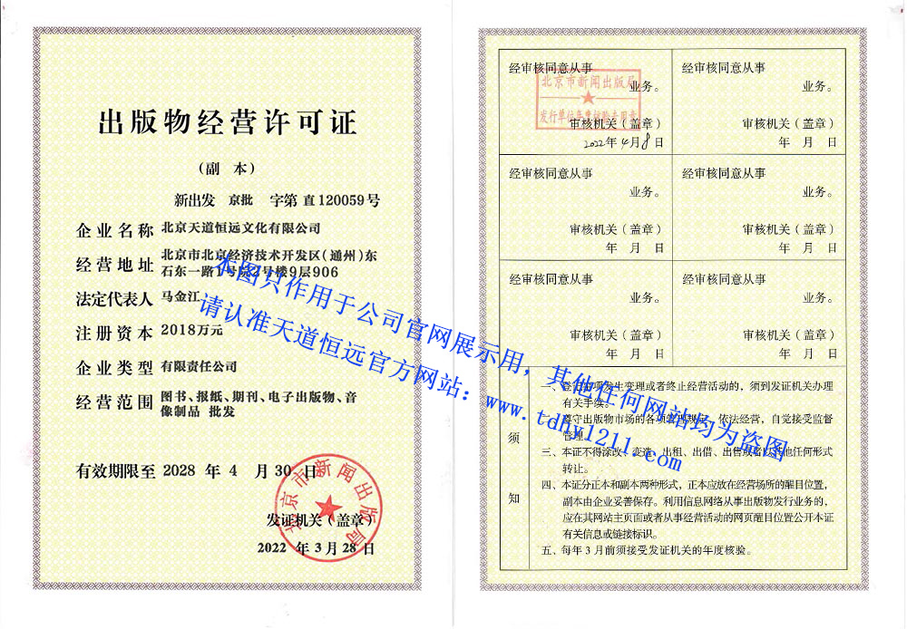 當(dāng)前位置:首頁(yè) » 資訊中心 » 榮譽(yù)證書(shū) » 天道恒遠(yuǎn)出版物經(jīng)營(yíng)許可證